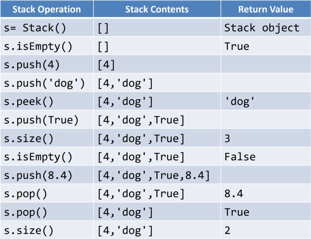 使用List对象实现栈,这里需要注意Stack的两端对应list设置,如果将List的末端作为栈顶,将使push()/pop()的复杂度为$O(1)$: